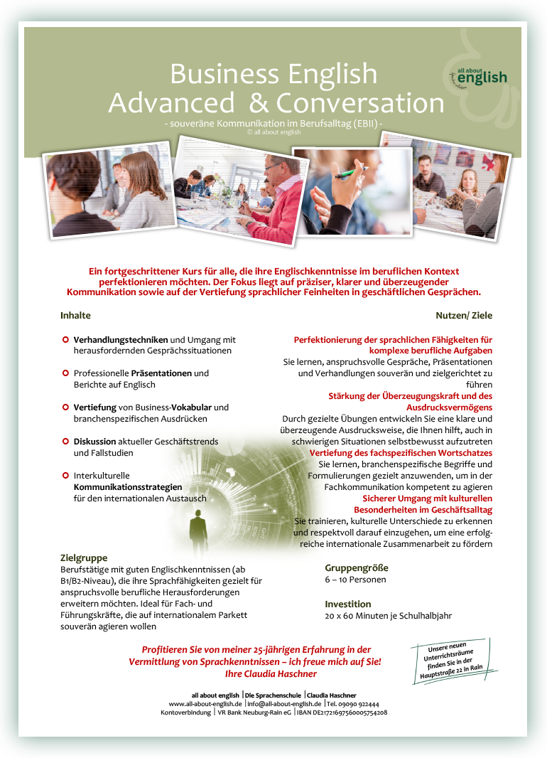 Ein fortgeschrittener Kurs für alle, die ihre Englischkenntnisse im beruflichen Kontext perfektionieren möchten. Der Fokus liegt auf präziser, klarer und überzeugender Kommunikation sowie auf der Vertiefung sprachlicher Feinheiten in geschäftlichen Gesprächen.